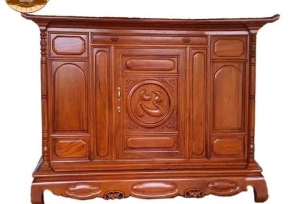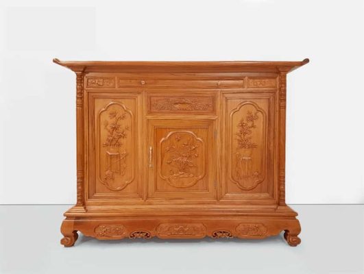 1 tủ lớn dùng để đặt các đồ thờ cúng như lọ cắm hoa, bộ ấm chén cúng hoặc ống cắm hương…. Mặt trước tủ được chạm khắc tinh xảo cùng chuỗi hạt được các nghệ nhân chạm trổ cẩn thận trên từng đường nét.